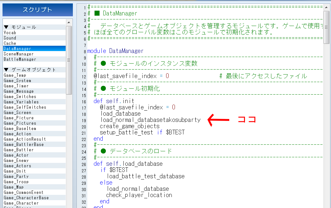 上のスクリプトたちを導入した後、本体のDataManager内のself.initのcreate_game_objectsの上にload_normal_databasetakosubpartyを挿入してください。