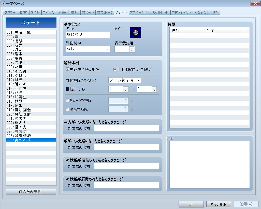 で身代わり状態に入ったキャラのステートを指定します。(state_id番のステートを指定)