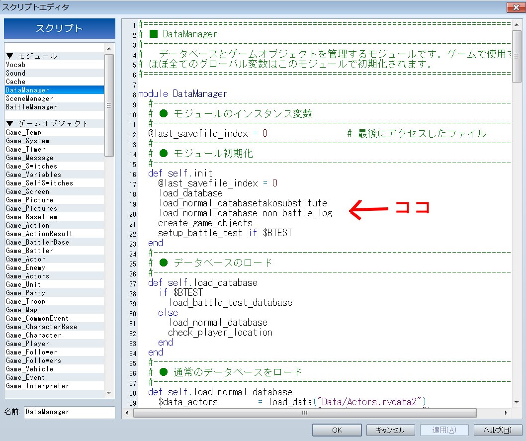 上のスクリプトを全て入れてDataManagerのself.initのload_databaseの下の辺りに