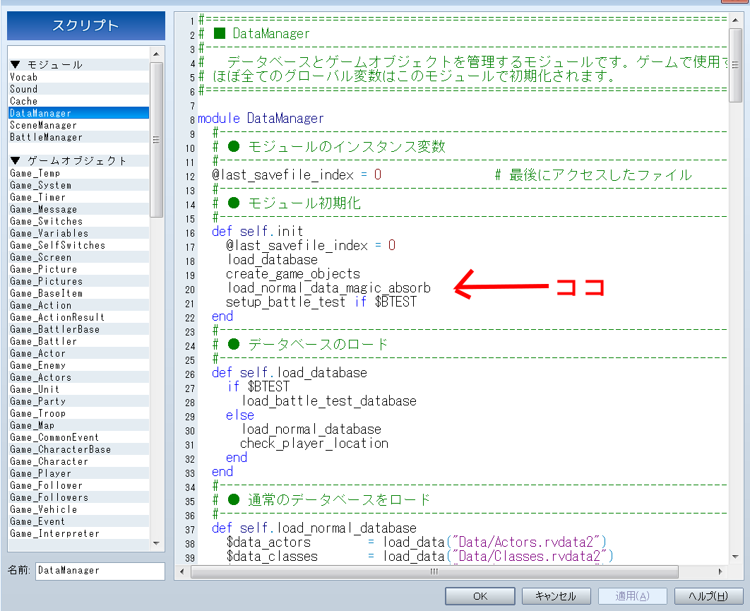 元のDataManagerのself.initのcreate_game_objectsよりも下にload_normal_data_magic_absorbを挿入します。