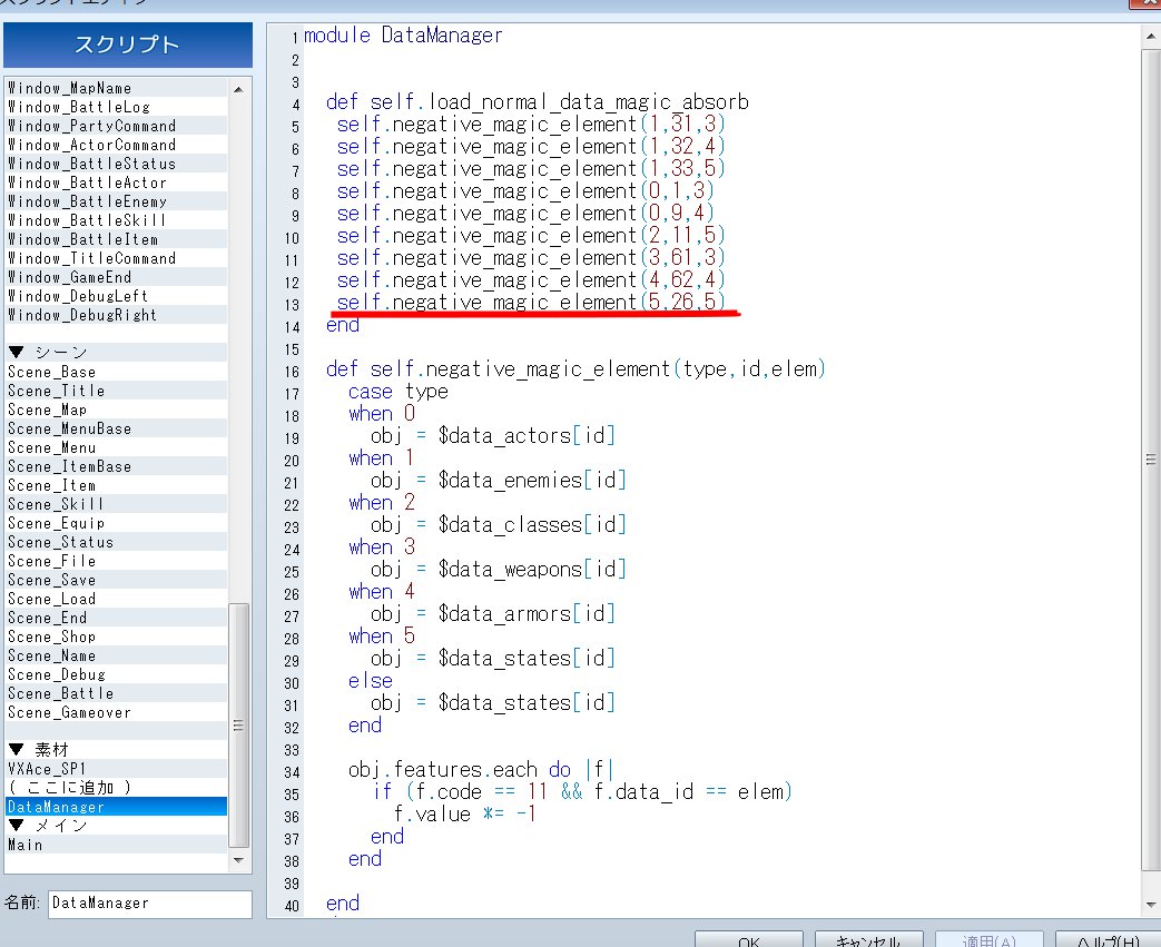 今更ですが昨日ゲームを作っているとき魔法を吸収できない(属性有効度で負の数を指定できない)ことに気づいたので、できるようにするスクリプトを作りました。