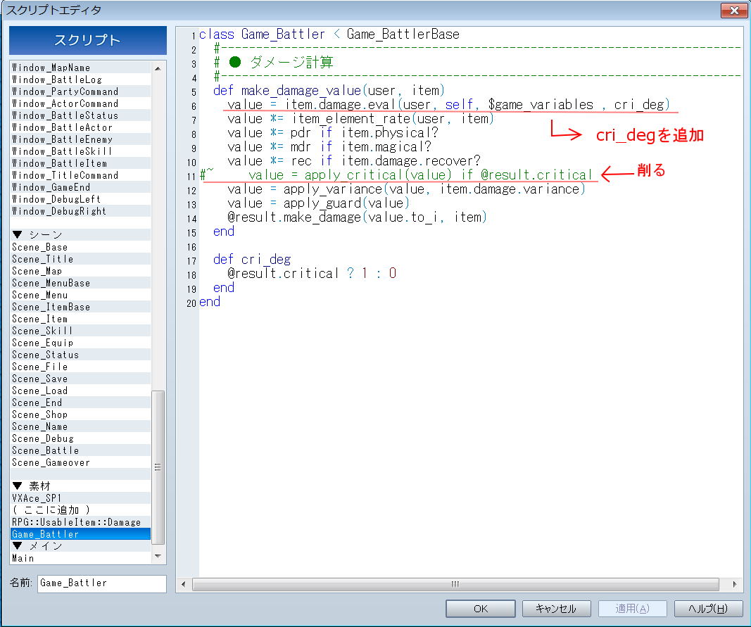 value = item.damage.eval(user, self, $game_variables, cri_deg)としてcri_degを次のように定義します。